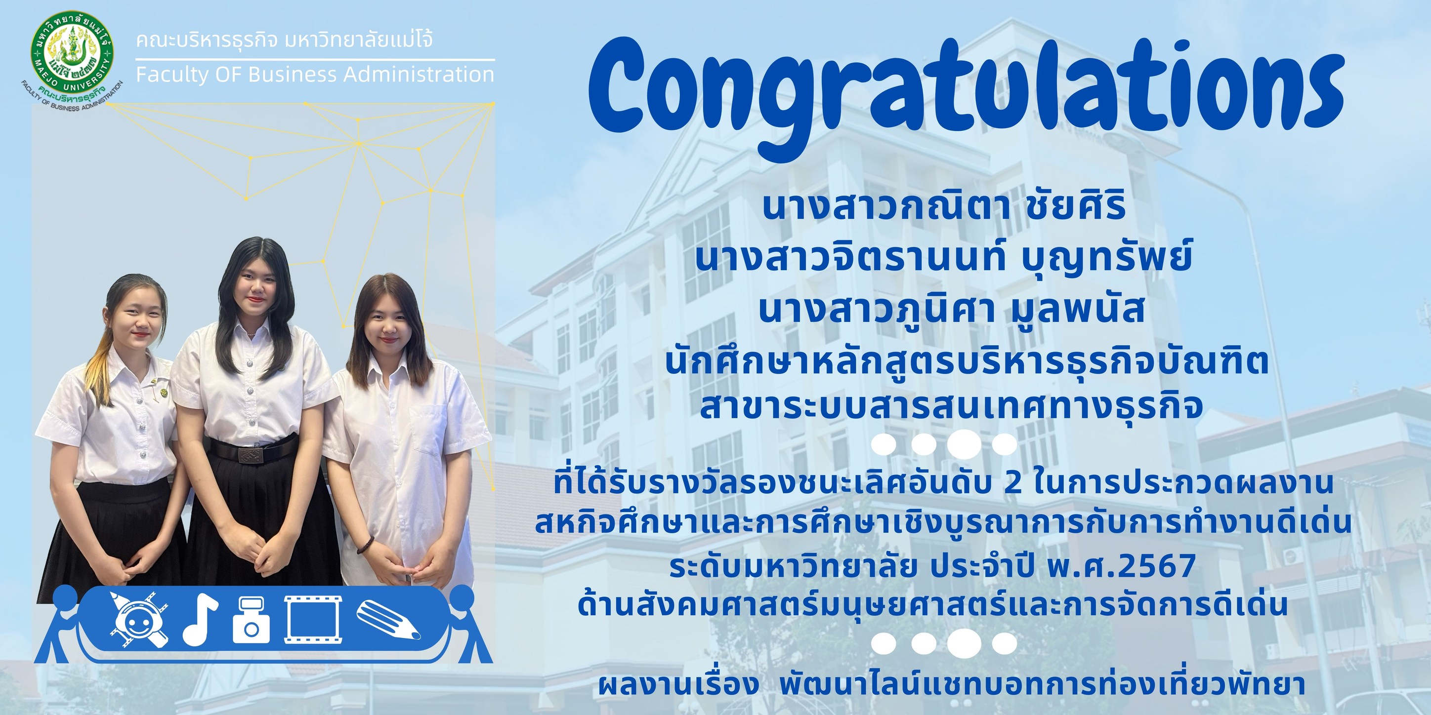 รางวัลรองชนะเลิศอันดับที่ 2 ผลงานเรื่อง พัฒนาไลน์แชทบอทการท่องเที่ยวพัทยา (Development of the Pattaya travel Line Chatbot) ได้แก่ นางสาวกณิตา ชัยศิริ รหัสนักศึกษา 6306105301 นางสาวจิตรานนท์ บุญทรัพย์ รหัสนักศึกษา 6306105304 และนางสาวภูนิศา มูลพนัส รหัสนักศึกษา 6306105308