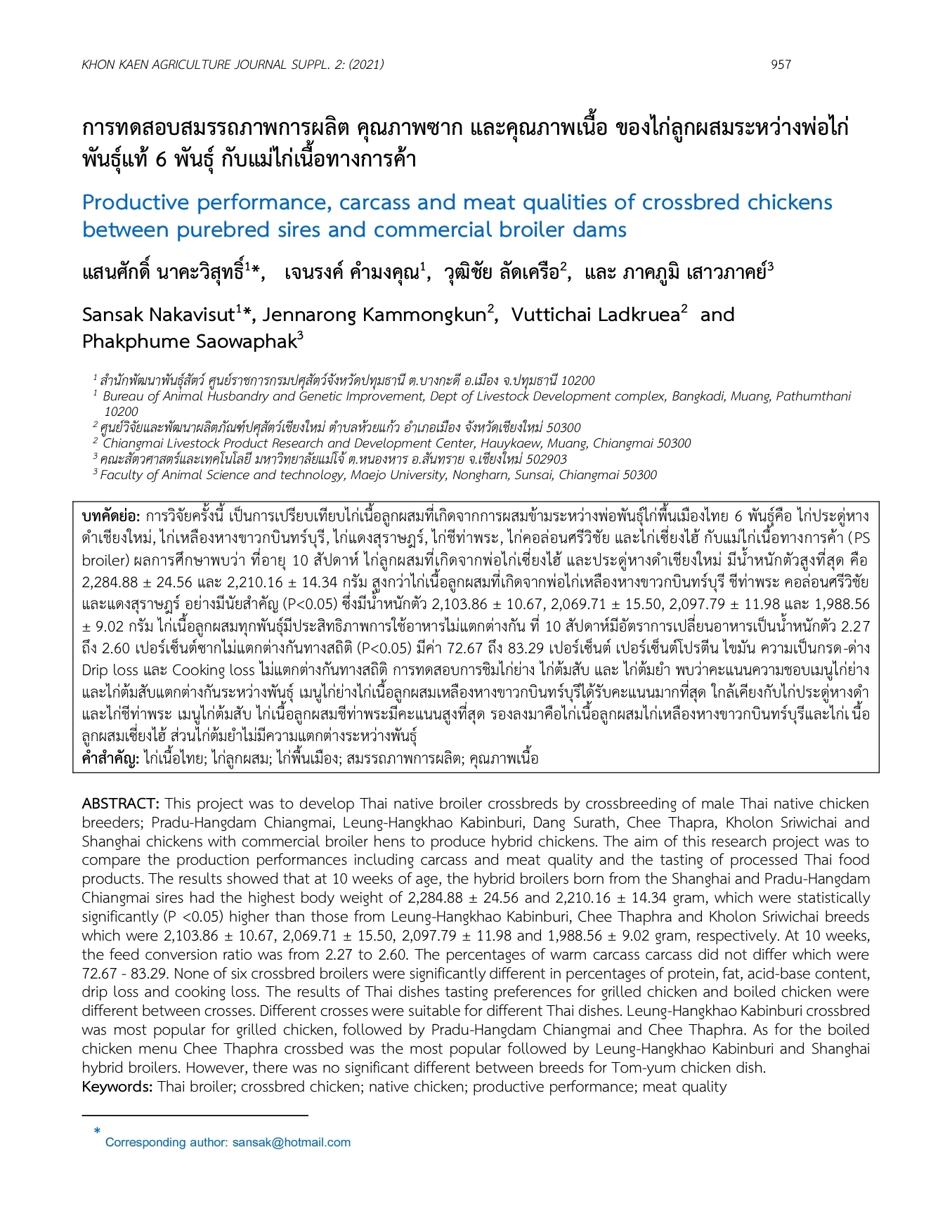 เข้าร่วมนำเสนอผลงาน โดยมีผู้ร่วม คือ คุณแสนศักดิ์ นาคะวิสุทธิ์, คุณเจนรงค์ คำมงคุณ, คุณวุฒิชัย ลัดเครือ เรื่อง การทดสอบสมรรถภาพการผลิต คุณภาพซาก และคุณภาพเนื้อ ของไก่ลูกผสมระหว่างพ่อไก่พันธุ์แท้ ๖ พันธุ์กับแม่ไก่เนื้อทางการค้า งานประชุมวิชาการสัตวศาสตร์ แห่งชาติครั้งที่ ๙