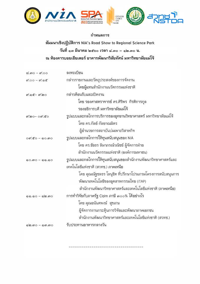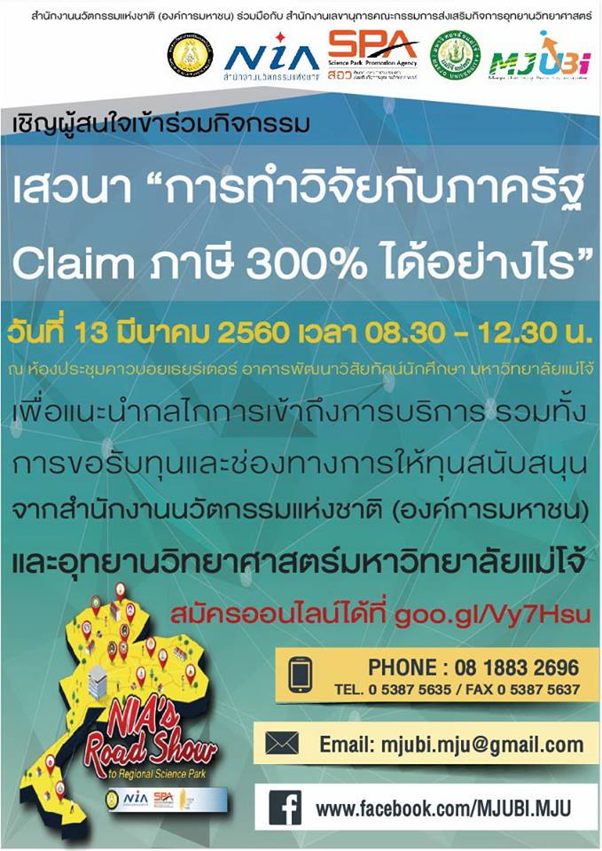 สำนักงานนวัตกรรมแห่งชาติ (องค์การมหาชน) ร่วมกับ อุทยานวิทยาศาสตร์ภูมิภาค มหาวิทยาลัยแม่โจ้ ขอเรียนเชิญเข้าร่วมกิจกรรม NIA’s Road Show to Regional Science Park ในวันที่ 13 มีนาคม 2560 เวลา 8.30-12.30 น. ณ ห้องคาวบอยเธียเตอร์ อาคารพัฒนาวิสัยทัศน์ มหาวิทยาลัยแม่โจ้ ลงทะเบียนออนไลน์ ได้ที่ goo.gl/Vy7Hsu ภายในงาน มีกิจกรรมรับโจทย์ความต้องการ พัฒนาข้อเสนอโครงการ และให้คำปรึกษาการวิจัยและพัฒนาด้านเทคโนโลยี การออกแบบผลิตภัณฑ์ การจัดการทรัพย์สินทางปัญญา บริการต่างๆ ของอุทยานวิทยาศาสตร์ ม.แม่โจ้ และ NIA และ สวทช. โดย นักวิจัยหรือผู้ประกอบการสามารถลงทะเบียนสำรองที่นั่งได้ที่ goo.gl/Vy7Hsu (รับจำนวนจำกัด)