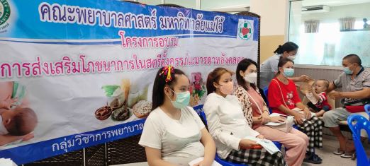 วันพุธที่ 3 พฤษภาคม 2566 คณะพยาบาลศาสตร์ มหาวิทยาลัยแม่โจ้ จัดโครงการบริการวิชาการ โครงการดูแลสุขภาพวิถีใหม่ในชุมชน "กิจกรรมอบรมการส่งเสริมโภชนาการในสตรีตั้งครรภ์และมารดาหลังคลอด" ณ โรงพยาบาลสันทราย ตำบลหนองหาร อำเภอสันทราย จังหวัดเชียงใหม่ เพื่อให้ความรู้และคำแนะนำด้านสุขภาพแก่ผู้เข้าร่วมโครงการ และประเมินภาวะสุขภาพแก่ผู้เข้าร่วมโครงการสามารถดูแลสุขภาพตนเองได้อย่างถูกต้อง และยังมีการบรรยายถึงภาวะซีดในสตรีตั้งครรภ์ ข้อควรปฏิบัติในการดูแลสุขภาพของสตรีตั้งครรภ์ และโภชนาการในสตรีตั้งครรภ์และมารดาหลังคลอด