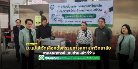วันพฤหัสบดีที่ 5 มีนาคม 2569 รองศาสตราจารย์ ดร.เกรียงศักดิ์ ศรีเงินยวง รองอธิการบดีมหาวิทยาลัยแม่โจ้ พร้อมด้วย ผู้ช่วยศาสตราจารย์ ดร.พิมพ์ชนก สังข์แก้ว ประธานสภาพนักงาน มหาวิทยาลัยแม่โจ้ เป็นประธานเปิดหีบหย่อนบัตรเลือกตั้งกรรมการสภามหาวิทยาลัยจากคณาจารย์ประจำแทนตำแหน่งที่ว่าง โดยมีกรรมการสภาพนักงาน คณาจารย์ บุคลากรกองเลขานุการสภามหาวิทยาลัย ร่วมเป็นสักขีพยาน ณ หน่วยเลือกตั้ง ห้องศรีเชียงดาว ชั้น ๑ อาคารเฉลิมพระเกียรติสมเด็จพระศรีนครินทร์ มหาวิทยาลัยแม่โจ้ จังหวัดเชียงใหม่ การเลือกตั้งในครั้งนี้เป็นไปตามมติที่ประชุมคณะกรรมการเลือกกรรมการสภามหาวิทยาลัยจากคณาจารย์ประจำแทนตำแหน่งที่ว่างในการประชุมครั้งที่ ๒/๒๕๖๙ โดยกำหนดให้มีการเลือกตั้งกรรมการสภาฯ ในวันพฤหัสบดีที่ 5 มีนาคม 2569 ตั้งแต่เวลา 08.30 - 15.00 น. จำนวน 3 หน่วยเลือกตั้ง คือ หน่วยเลือกตั้ง มหาวิทยาลัยแม่โจ้ จังหวัดเชียงใหม่ , หน่วยเลือกตั้ง มหาวิทยาลัยแม่โจ้ - ชุมพร จังหวัดชุมพร และ หน่วยเลือกตั้ง มหาวิทยาลัยแม่โจ้ – แพร่ เฉลิมพระเกียรติ จังหวัดแพร่