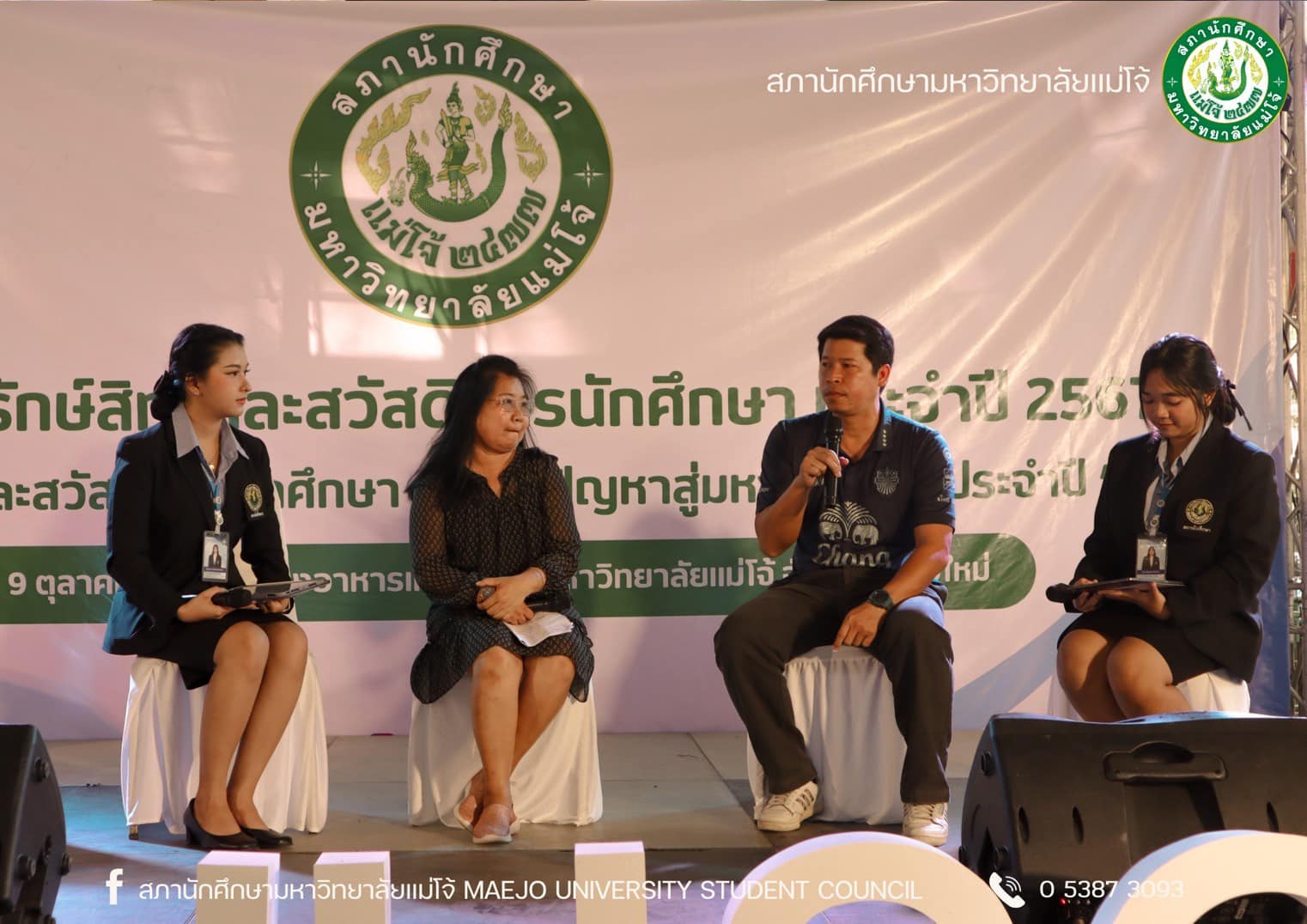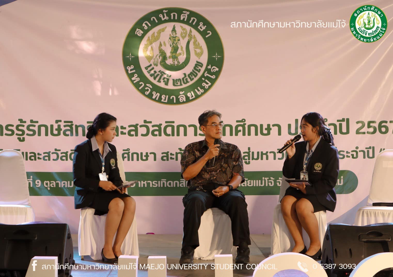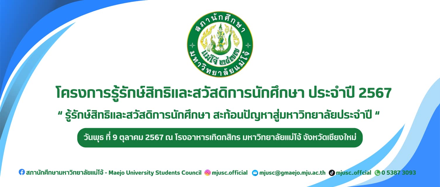 สภานักศึกษา มหาวิทยาลัยแม่โจ้ จัดกิจกรรมโครงการรู้รักสิทธิ์และสวัสดิการนักศึกษา ประจำปี 2567 ในวันที่ 9 ตุลาคม 2567 ณ โรงอาหารเทิดกสิกร มหาวิทยาลัยแม่โจ้ จังหวัดเชียงใหม่ โดยจัดกิจกรรมในลักษณะเวทีเสวนาร่วมกับหน่วยงานต่าง ๆ ภายในมหาวิทยาลัย ซึ่งมีเนื้อหาการเสวนาประกอบด้วยการให้ความรู้เรื่องสิทธิและสวัสดิการที่นักศึกษาควรจะได้รับจากมหาวิทยาลัย อาทิ สวัสดิการเกี่ยวกับห้องสมุด สวัสดิการหอพัก สวัสดิการที่เกี่ยวกับสุขภาวะ เป็นต้น และการเสวนาประเด็นปัญหาต่าง ๆ ที่เกิดขึ้นจนส่งผลกระทบต่อนักศึกษา รวมถึงให้หน่วยงานที่เกี่ยวข้องได้ตอบข้อซักถามจากนักศึกษา พร้อมทั้งแลกเปลี่ยนความคิดเกี่ยวกับแนวทางแก้ไขปัญหาที่เกิดขึ้น ซึ่งกิจกรรมเสวนาแบ่งออกเป็น 3 ช่วง ได้แก่ ช่วงที่ 1 หัวข้อเสวนา “สิทธิ หน้าที่ และสวัสดิการของนักศึกษา” เนื้อหาการเสวนาประกอบด้วยการให้ความรู้เรื่องสิทธิและสวัสดิการที่นักศึกษาควรจะได้รับจากมหาวิทยาลัย โดยมีเชิญเจ้าหน้าที่ของแต่ละหน่วยงานของมหาวิทยาลัยร่วมการเสวนา นำโดยผู้อำนวยการสำนักหอสมุด, หัวหน้างานวินัยและพัฒนานักศึกษา, หัวหน้างานกีฬา, หัวหน้างานหอพัก, เจ้าหน้าที่กองกายภาพและสิ่งแวดล้อม, หัวหน้างานบริการและสวัสดิการนักศึกษา และหัวหน้างานอนามัยและพยาบาล ช่วงที่ 2 หัวเสวนาข้อ “สิทธิ หน้าที่ และสวัสดิการของนักศึกษาที่มหาวิทยาลัยจัดสรรให้” นำการเสวนาโดยประธานสภานักศึกษา ช่วงที่ 3 หัวข้อเสวนา “สิทธิ หน้าที่ และสวัสดิการของนักศึกษาที่คณะ/วิทยาลัยจัดสรรให้” โดยเชิญนายกสโมสรนักศึกษาต่าง ๆ มาเข้าร่วมเสวนา ในการพักช่วงเสวนาแต่ละช่วงจะมีการแสดงดนตรีบนเวที กิจกรรมตอบคำถามรับของที่ระลึก และกิจกรรมเสนอข้อคิดเห็นบนบอร์ดสภานักศึกษา