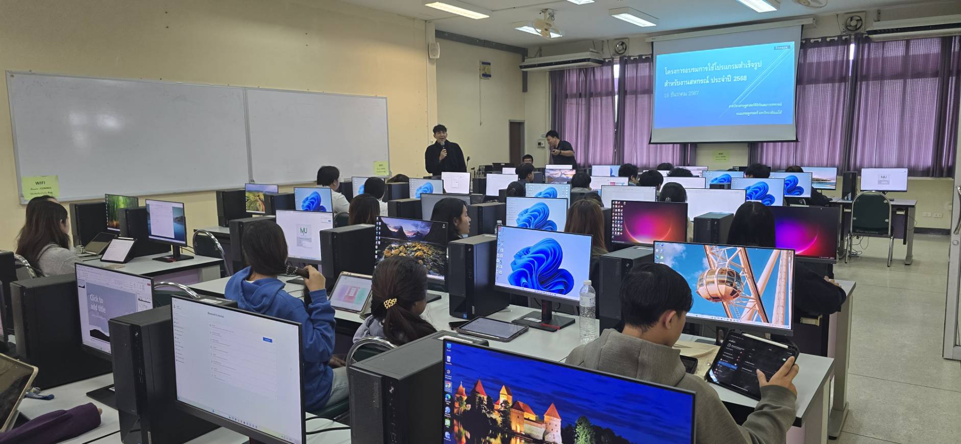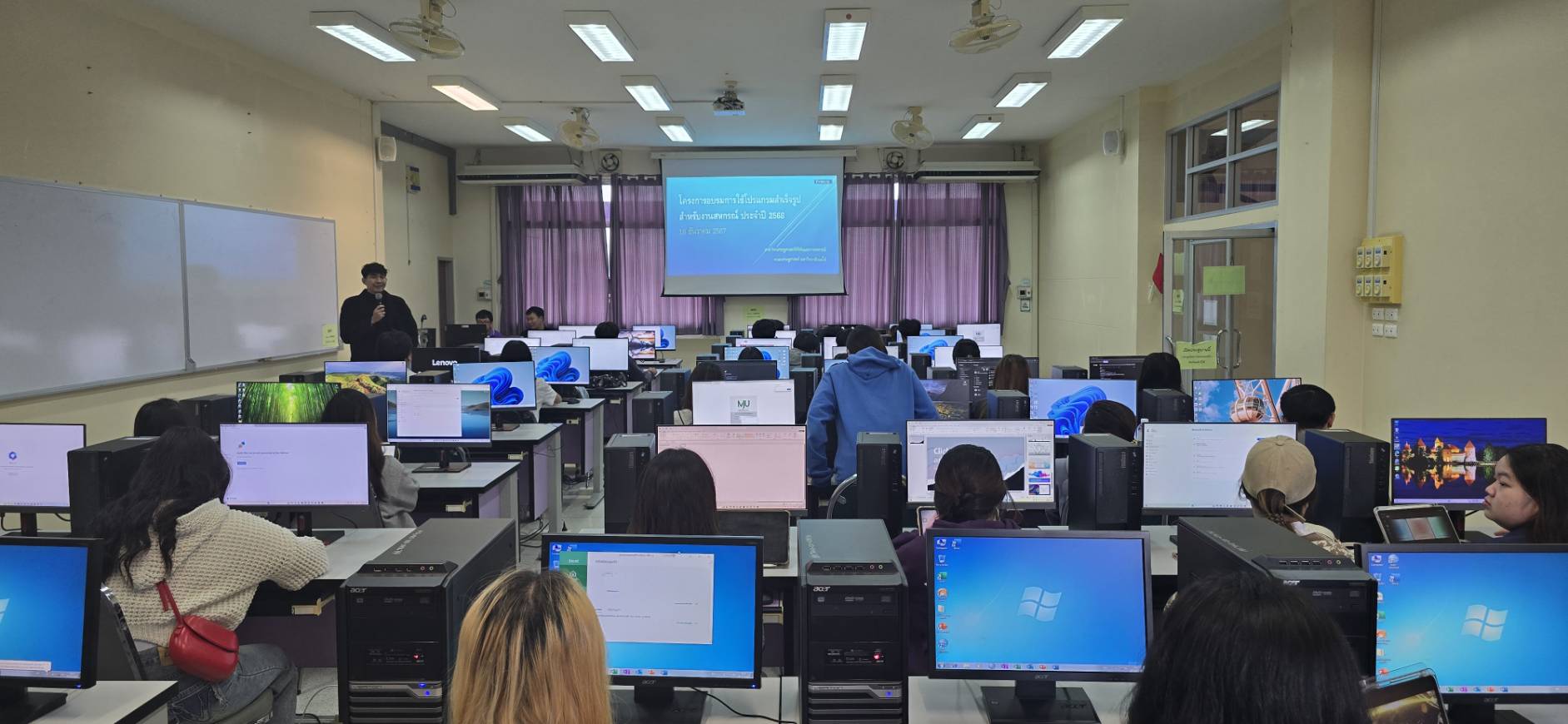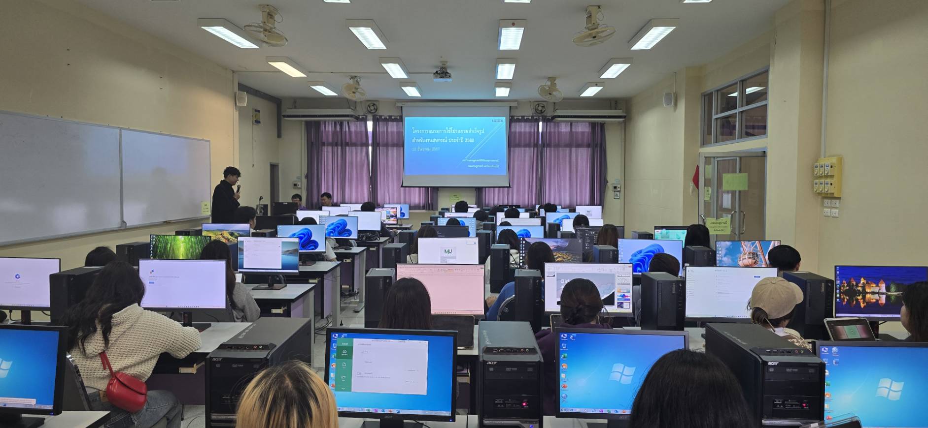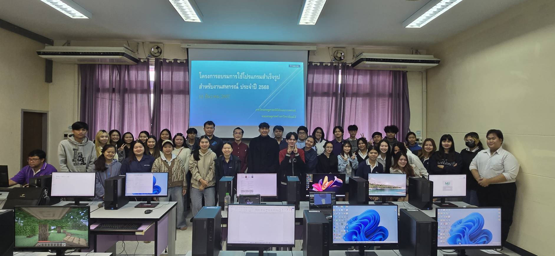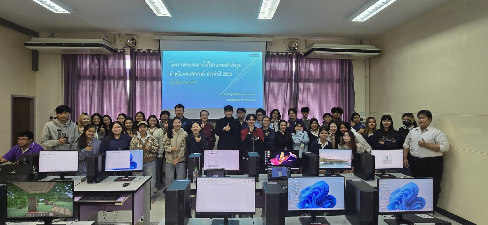 นักศึกษามีความรู้และทักษะในการใช้โปรแกรมประยุกต์ต่าง ๆ โดยเฉพาะอย่างยิ่งโปรแกรมสำเร็จรูป MS-Office (Word, Excel, Powerpoint) ในวันที่ 18 ธันวาคม 2568 จำนวน 57 คน มีความพึงพอใจในภาพรวมของโครงการจากผลสรุปภาพรวมความพึงพอใจของผู้เข้าร่วมโครงการ มีค่าเฉลี่ย เท่ากับ 4.91 ซึ่งมีความพึงพอใจระดับ “มาก”