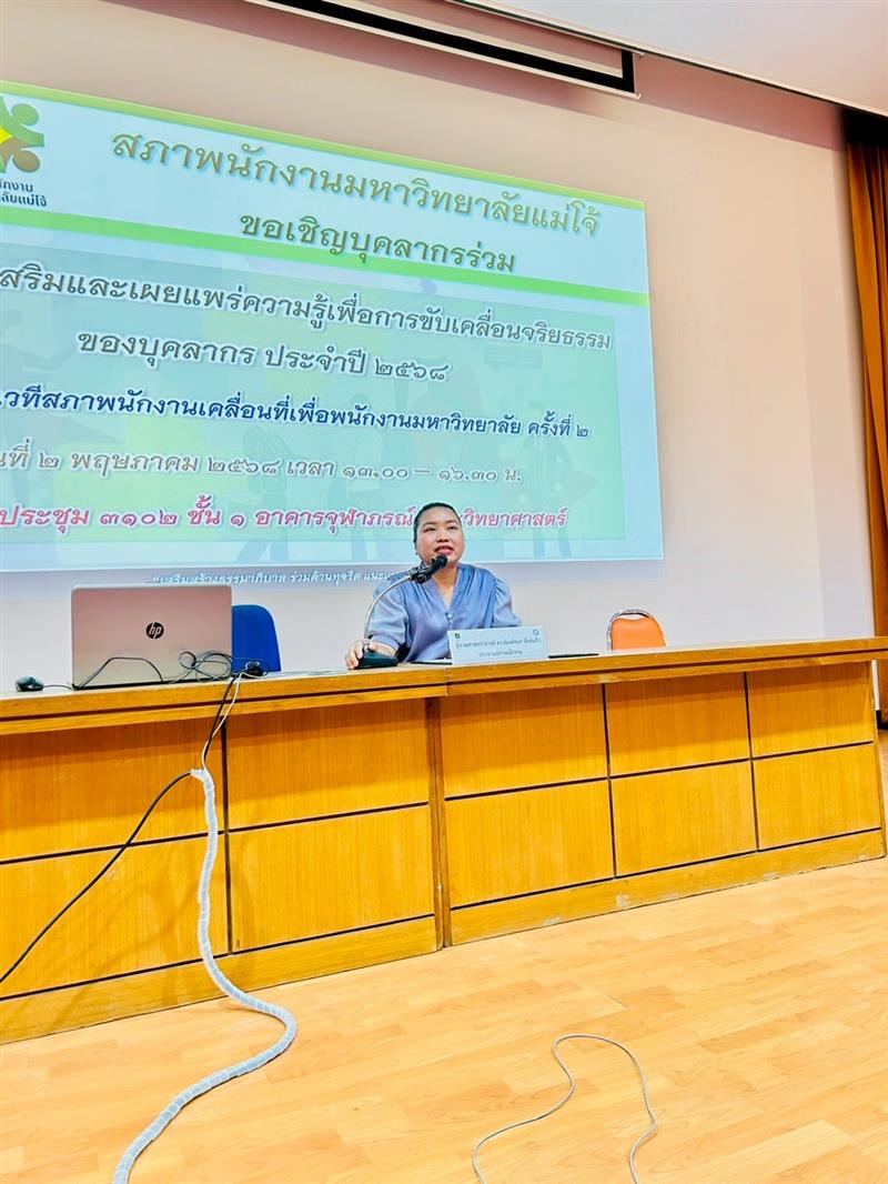 ได้ดำเนินการส่งเสริมและเผยแพร่ความรู้เพื่อการขับเคลื่อนจริยธรรมของบุคลากร ให้กับบุคลากรที่เข้าร่วมการอบรมตัวแทนจากทุกส่วนงาน ยกเว้นมหาวิทยาลัยแม่โจ้-แพร่ฯ และมหาวิทยาลัยแม่โจ้-ชุมพร